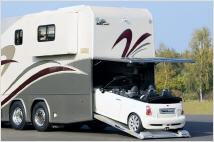 Auf das Omnibus-Chassis hat man in Bohmte beim 1200 Latinum eine selbsttragende Karosserie aus glasfaserverstärktem Kunststoff gepackt. Diese ist versehen mit drei hydraulisch ausfahrbaren Erkern, sie erweitern den ohnehin nicht knapp bemessenen Wohnraums im Stand noch zusätzlich. Unter dem Schlafraum im Heck findet ein Mini in der integrierten Pkw-Garage Platz. Für Ausflüge in die Umgebung, wenn das zwölf Meter lange Mobil geparkt ist. Denn das Befahren enger innerstädtischer Straßen ist nicht die Lieblingsdisziplin des in fahrbereitem Zustand rund 14,7 Tonnen wiegenden und knapp vier Meter hohen Dickschiffs.