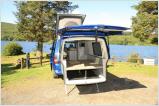 Das für den VW T5 konzipierte Doubleback ist ähnlich aufgebaut: Als elektrisch nach hinten ausfahrbare Wohnzelle. Die Grundidee ist simpel und bestechend. Im Fahrbetrieb und im ruhenden Verkehr – sprich auf dem Parkplatz – ist der VW Bus so kompakt und handlich, wie er das Werk in Hannover verließ. Auf dem Campingplatz oder in der freien Natur fährt die rund 150 Kilogramm wiegende Heckschublade auf Knopfdruck elektrisch aus. In rund 45 Sekunden soll der Vorgang erledigt sein. Die rund zwei Meter lange Wohnzelle kann nach Angaben des Herstellers mit rund 400 Kilogramm belastet werden. Das reicht für zwei Schlafende, die sich im Heck des Fahrzeugs zur Ruhe betten wollen.