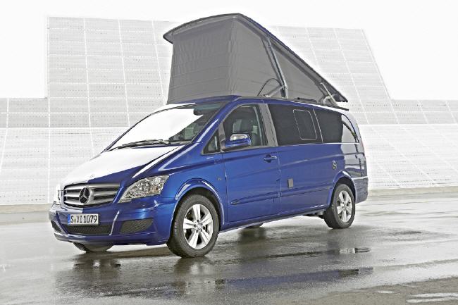 Eine weitere Bettstatt (200 x 110 cm) findet sich serienmäßig im Aufstelldach, das optional bequem per Knopfdruck elektrohydraulisch nach oben fährt. Trotz Aufstelldach bleibt der Marco Polo mit einer Gesamthöhe von 196 cm noch garagentauglich und passt auch in Waschstraßen. Der Marco Polo verfügt serienmäßig über eine Warmluft-Zusatzheizung und eine 80 Ah Bordbatterie. Um diese nicht übermäßig zu belasten, hat Daimler seinem kompakten Reisemobil im Heck stromsparende LED-Leuchten spendiert. Nettes Features sind die serienmäßige Einkaufs-Klappbox, die unter der Liegefläche befestigt werden kann, und ein abschließbares Wertfach. Auf Wunsch gibt es, in Verbindung mit dem COMAND-System, als Rückfahrhilfe eine in die Kennzeichenblende der Heckklappe integrierte Rückfahrkamera. Bei eingelegtem Rückwärtsgang erfolgt die Anzeige des Kamerabilds, unterstützt durch eingeblendete Linien, über den COMAND-Bildschirm.