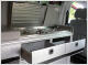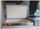 So blieb es dann auch beim schon „klassischen“ Grundriss des in hellgrau gehaltenen Ausbaus, der gut mit dem neu angebotenen Fußboden in Holzoptik harmoniert. Seitlich auf der Fahrerseite ist der Küchenblock untergebracht, mit Spüle, Zweiflammkocher, 40 Liter Kompressor-Kühlbox und Tisch. An Bord sind Tanks für 36 Liter Frischwasser und ein 32 Liter fassender Abwassertank. Zum Heck hin schließen sich der Kleiderschrank und Staufächer an, alle mit Rolladentüren versehen. Die Kombination aus drehbaren Vordersitzen und Sitzbank bietet Platz für eine gemütliche Runde. Die Zweier-Rückbank bietet eine verschiebbare Sitzkonstruktion mit elektrisch verstellbaren Einzelsitzen und elektropneumatisch aufblasbaren Sitzwangen, sie kann zu einer Liegefläche von 203 x 117 cm umgeklappt werden.