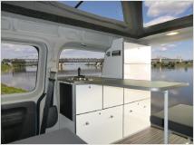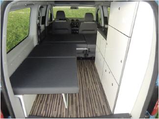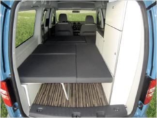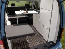 Knüller des Caddy Camp Maxi: Selbst wenn der Caddy im Alltag als vollwertiger Fünfsitzer oder als Lastesel genutzt wird, kann der Campingausbau an Bord bleiben. So ist dann auch ein weiteres Einzelbett von 200 x 70 Zentimeter im Untergeschoß verfügbar. Bei Bedarf lässt es sich zu einem Doppelbett von 200 x 113 cm umbauen lässt. Dazu gibt Reimo dem Caddy Camp einen Schiebetisch, eine Miniküche mit Edelstahlspüle, eine Wasseranlage, einen per Gaskartuschen befeuerten Kocher im Auszug und eine tragbare Kompressor-Kühlbox mit auf den Weg in Richtung Wochenend-Trip oder Urlaub. Mit an Bord sind außerdem Staufächer und sogar eine Unterbringungsmöglichkeit für das Camping-WC. Selbst an einen Stoff-Kleiderschrank zur Unterbringung von Bekleidung haben die Egelsbacher gedacht. Voll alltagsgauglich bleibt der Camping-Caddy aus Egelsbach auch aus einem anderen Grund: Mit seiner Gesamthöhe von 1,96 Meter passt er nach wie vor in (Tief-)Garagen. Ein Preis für den Caddy Camp mit seinen drei Schlafplätzen steht leider noch nicht fest. Weitere Infos: www.reimo.com.