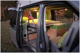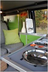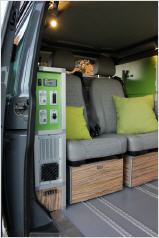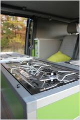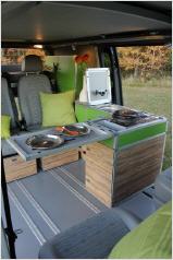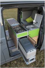 In der Basisversion kommt der Tecamp mit einer Kompressor-Kühlbox WAECO CDF25 (optional ist ein größeres Küchenmodul mit einer Waeco CF35 lieferbar), einem herausnehmbaren Origo Spirituskocher mit zwei Flammen sowie einem Edelstahl-Spülbecken zum Kunden. Wie im Treck bildet ein maßgefertigter, 40 Liter fassender Tank die Basis der Wasserversorgung, ergänzt durch eine elektronisch gesteuerte Druckpumpe sowie zwei Wassersteckdosen und eine Handdusche. Konsequent individualisieren und auf ganz persönliche Bedürfnisse zuschneiden lässt sich der kompakte Camper durch eine zusätzliche Staubox hinter dem Fahrersitz und weitere Stausystemen im Heck.