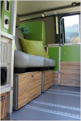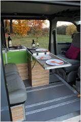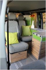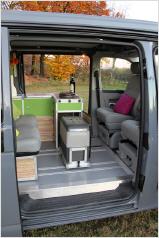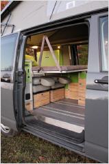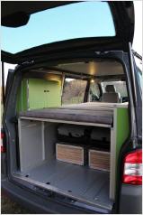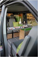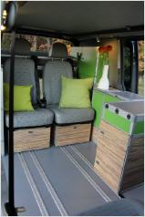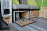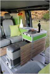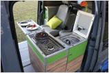 Wie bei Terracamper üblich können die Möbel-Module und Sitze in wenigen Minuten ausgebaut und demontiert werden. Der angebotene Grundriss erlaubt die Nutzung der Küche sowohl im Innenraum als auch von aussen. Da der Tecamp mit zwei Schiebetüren angeboten wird, kann die Küche auch durch die linke Schiebetür bedient werden. Für bequemen Zugang ist die Kühlbox auf einem zweiseitigen Auszug montiert.