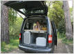 Terra Camper verpasst dem Volkswagen einen funktionalen und gut ausgestatteten Wohnausbau mit auf der Fahrerseite angeordneter Längsküche und einer gegenüber liegenden Längs-Sitzbank. Sie erlaubt zwei Personen auch bei schlechtem Wetter den Aufenthalt im Fahrzeug. Obendrein kann die Seitensitzbank mit wenigen Handgriffen in ein kommodes Doppelbett mit einer Liegefläche von 120 x 200 cm verwandelt werden. Der zweiflammige Spirituskocher Origo 3000 von Dometic kann sowohl in der Küchenzeile selbst, auf dem Klapptisch unter der Heckklappe oder auch gänzlich im Freien genutzt werden. Soll bleibt der Geruch des frisch am Hafen gekauften Fischs appetitanregend in der Nase, und nicht im Fahrzeug hängen. Ein Waschbecken und die in einem Seitenstaufach hinter dem Fahrersitz untergebrachte Kompressor-Kühlbox CF 35 von Waeco sind ebenfalls von außen und innen zugänglich. Über eine Wassersteckdose an der Front der Küche wird die einsteckbare Handbrause mit Wasser versorgt. An verschiedenen Positionen montierbare Halter ermöglichen die Nutzung als Außendusche. Insgesamt 24 Liter Frischwasser und 12 Liter Abwasser, in Kanistern gespeichert, bilden das geschlossene Wassersystem des Temax. In der Sitzbank des Kompaktmobils ist, neben viel Stauraum, Platz für ein transportables WC, für den Einsatz bei dringenden Notfällen.