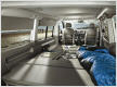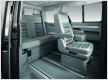 Der Kunde hat die Wahl: Entweder entscheidet er sich für den vier- bis fünfsitzigen Camper-Grundriss mit Staubox. Oder er gibt dem fünf- bis siebensitzigen Innenraumkonzept den Vorzug. In dieser Version taugt der California Beach als kommode Großraumlimousine. In beiden Ausführungen sind die Vordersitze drehbar ausgeführt. In der Schiebetür ist ein Tisch untergebracht, der im Fahrzeug oder draußen genutzt werden kann. Für das Frühstück an der frischen Luft können aus der Heckklappe noch zwei Klappstühle gezaubert werden. Ab der B-Säule übernehmen Rollos die Verdunkelung zur Nacht, an den vorderen Scheiben verhindern Spanntücher ungewollte Einblicke. Für frische Luft sorgt ein Schiebefenster auf der linken Fahrzeugseite.