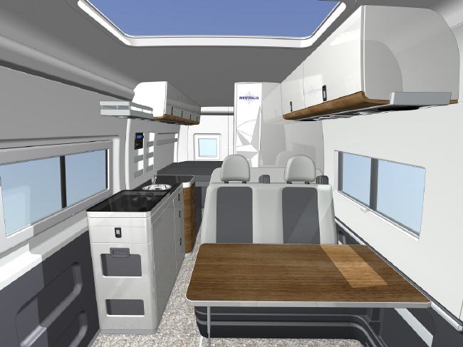 Erstmalig setzt der Kastenwagen-Ausbauer auf ein fest eingebautes Heckbett, das ohne Umbau oder Kletterpartie ins Dachgeschoss zur Verfügung steht. Im Heck des knapp sechs Meter langen Mobils darf noch geschlafen werden, während im Wohnbereich bereits der Frühstückstisch gedeckt wird. Die hintere Hälfte des Bettes kann durch eine Schlittenkonstruktion hochgeklappt werden. So können im Heck beispielsweise Fahrräder verstaut werden. Auf der Beifahrerseite ist vor dem Bett die Nasszelle installiert. Sie bietet Dusche, Toilette und Waschbecken. Die seitliche Küchenzeile ragt auf der Beifahrerseite in den Bereich der Schiebetür. Sie ist mit einer Koch-Spül-Kombination und einer ausziehbaren Kühlbox ausgestattet, die von innen wie auch von außen zugänglich ist. Für Wärme im Winter sorgt eine 4,8 kW Warmwasserheizung von Eberspächer mit serienmäßiger Fußbodenheizung. Angekündigt sind als Option außerdem eine beheizte Duschtasse und eine ebenfalls beheizbare Duschrückwand.