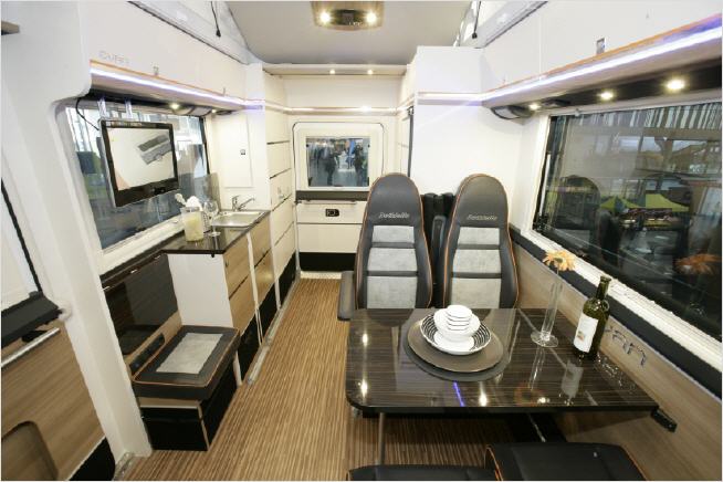 Für die Alltagstauglichkeit sprechen die kompakten Abmessungen. Der auf der Basis des Fiat Ducato (Radstand: 3.450 mm) aufbauende Evan ist gerade mal 565 Zentimeter lang, 215 cm breit und 275 Zentimeter hoch. Damit ist er recht handlich geraten. Für ordentliche Fahrleistungen sorgt ein Dreiliter-Diesel mit 6-Gang-Handschaltung, der muntere 177 Pferdchen traben lässt. Sportlich wirkt der Evan durch Reifen der Dimension 255/55 R 18, aufgezogen auf 18 Zoll-Felgen.