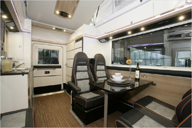 Der Evan bietet vier Schlafplätze, zwei davon im vom Fahrerhausdach absenkbaren Hubbett, das eine Liegefläche von rund 190 x 150 cm aufweisen soll. Ein Aufstelldach bietet eine weitere Schlafstatt mit einer Größe von 205 x 142 cm. Der Knüller der zwei Liegestätten: Sie stehen ohne aufwändigen Umbau der Sitzgruppe zur Verfügung. Damit der Evan auch in der kälteren Jahreszeit genutzt werden kann, ist unterflur eine Diesel-betriebene Heizung verbaut.