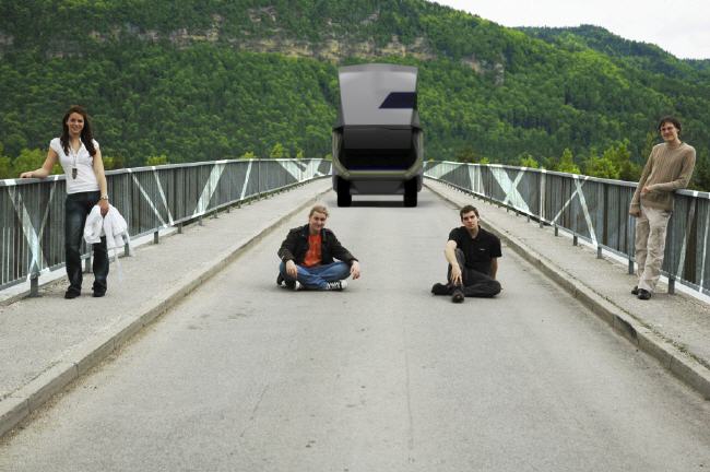 „Das Problem des Platzmangels konnte nur durch eine komplette Veränderung des Raumkonzeptes beseitigt werden“, erklären die Schüler. „Wir haben uns alle fixen Elemente des Innenraumes angesehen und sind zu dem Schluss gekommen, die größten und sperrigsten Elemente – nämlich die beiden Betten – nach außen zu verlagern.“ Diese befinden sich unter dem eigentlichen Wohnraum, in zwei separaten Schubladen, die nach außen aufgezogen werden können. „Um nicht im Freien schlafen zu müssen, haben wir eine Kuppel entwickelt, die an die Hartschale eines Gürteltieres erinnert.“ Durch zwei dieser Hartschalenkuppeln sind die je 1,40 Meter breiten Schlafplätze voneinander getrennt. In die Kojen gelangt man durch zwei Türen im Innenraum, die gleichzeitig als Nachtkästchen dienen.