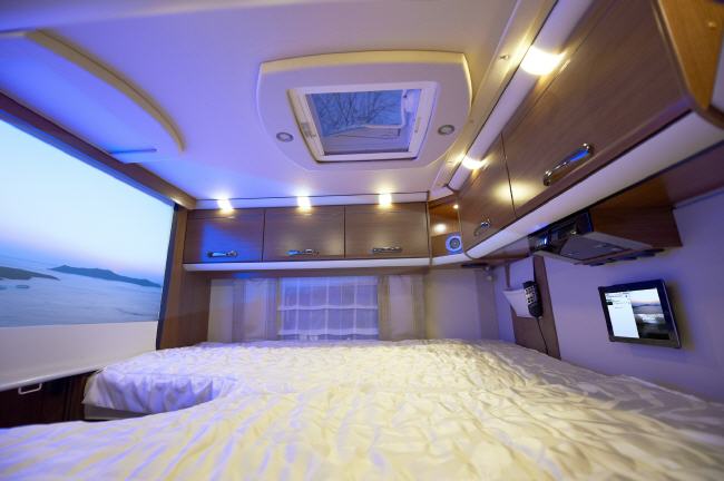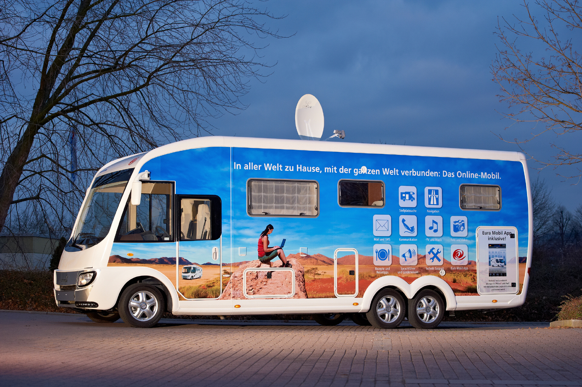 Die parallele Nutzung von Internet-Telefonie und Online-Kommunikation ermöglichen eine moderne Satelliten-Anlage im Online-Mobil und neue W-LAN-Angebote auf europäischen Stellplätzen. In Verbindung mit dem Tablet-PC steuert die TV-Box Fernsehanwendungen, möglich sind auch Downloads und das Abspielen von digital gespeicherter Musik über das integrierte Soundpaket des Wohnmobils. Ein LED-Beamer projiziert brillante Bilder auf eine 120 x 80 cm breite Leinwand im Schlafzimmer und sorgt so für Kino-Feeling auf dem Campingplatz.