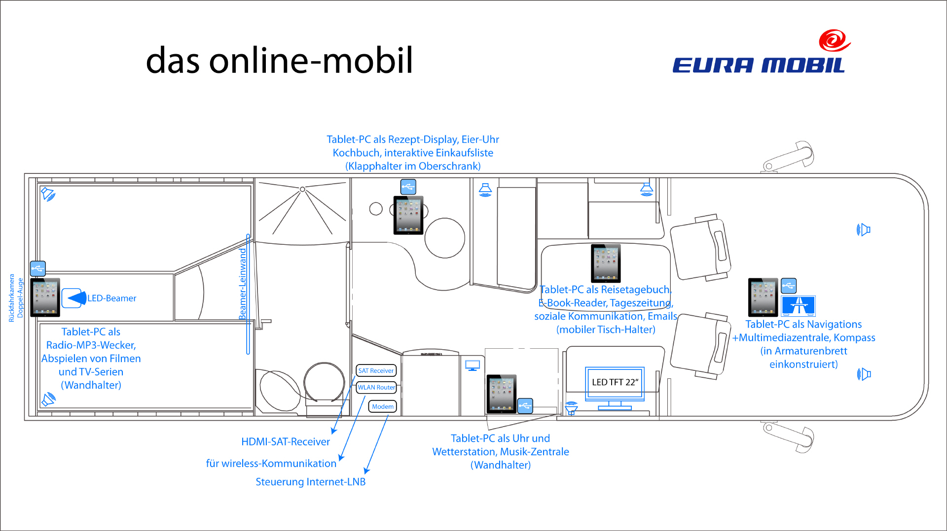 Der Tablet-PC wird multifunktional im Mobil integriert, möglich machen das mehrere Halterungen mit Ladestationen an zentralen Punkten wie Armaturentafel (für Navigation), Tisch (für z.B. E-Book und Notebook-Funktionen), Küche (für Rezeptabrufe) und Schlafzimmer (Steuerung der TV-Anlage).