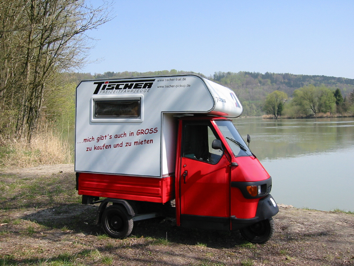 Was macht man, wenn man im Süden Deutschlands Vertriebspartner vom traditionsreichen Hersteller von Absetzkabinen, der Firma Tischer, ist – und auf der Suche nach einem originellen Werbeträger? Firmenchef Uwe Hollenbacher von Tischer Süd wusste Rat. Und ließ sich in Kreuzwertheim eine Kabine für seine Piaggio Ape bauen. Fertig ist ein Hingucker ersten Ranges, der seinen Zweck erfüllt: Aufmerksamkeit erregen. Als Reisemobil taugt der dreirädige Italiener mit Aufbau allerdings nicht. „Dazu wäre es dann doch ein wenig zu klein“, gibt Hollenbacher zu.