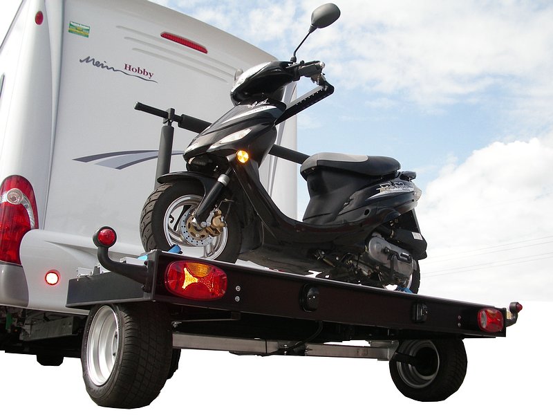 SMV hat einen speziellen Anhänger konzipiert, den 120 Kilogramm leichten Alu-Star-Rolli. Auf der fahrbaren Plattform können Lasten jeglicher Art mit einem Gewicht von bis zu 600 Kilogramm untergebracht werden. Der Anhänger mit einzeln aufgehängten Ballonräder ist gerade mal zwei Meter breit und inklusive des Zugrohrs auch nur zwei Meter lang. Die kompakte Einheit ist wendig und fahrstabil. Beladen wird die Plattform wie ein herkömmlicher Motorradträger. Über eine seitlich eingehängte Rampe wird das Zweirad auf die Reifenschiene der Plattform geschoben, die Räder verkeilt und das Fahrzeug am Haltebügel mit Schraubklammern befestigt und verzurrt. Bis zu 5 Fahrräder, ein Roller mit Doppelrädern vorne oder ein Quad lassen sich auf dem Hänger, der individuell nach Kundenwunsch konfiguriert werden kann, transportieren. Daheim kann der SMV-Rolli platzsparend auf seinen Standbügeln, mit der Deichsel nach oben, senkrecht an die Wand gestellt werden. Grundpreis: 1.999.— Euro.