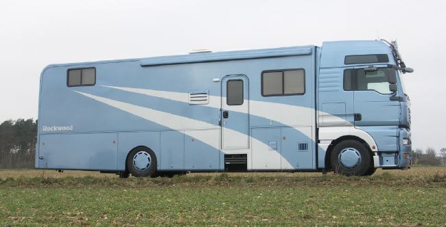Ja, es ist ein Reisemobil, eindeutig. Auch wenn man das dem in Blau-Silber-Metallic lackierten MAN TGA 18.400, geziert von einem Chrom-Bügel mit vier mächtigen Scheinwerfern auf dem Fahrerhausdach ganz weit oben, nicht auf den ersten Blick ansieht. Gut 3,70 Meter ist er hoch, satte 2,55 Meter breit, obendrein gute elf Meter lang. Fast ebenso lang wie das (T)Raumschiff ist seine Modellbezeichnung ausgefallen: Rockwood Classic Royal 1100 QB/SO heißt das gute Stück. Werfen wir einen zweiten Blick auf – und in - das Schiff.