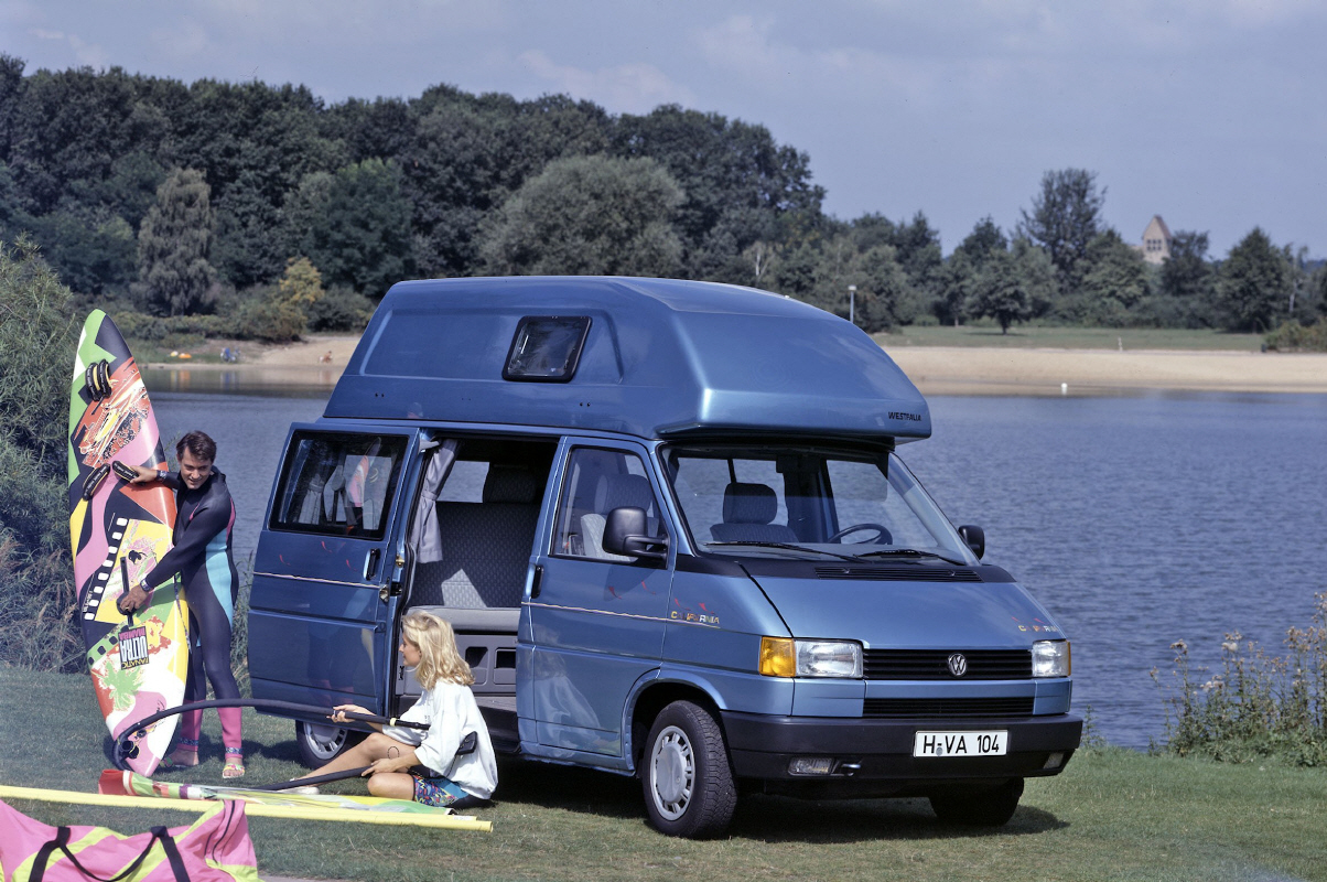 Im Sommer 1990 präsentiert Volkswagen auf dem Messegelände in Hannover den neuen Transporter, den T4. Volkswagen bricht mit allen Traditionen: Motor und Antrieb sind vorn, das quer eingebaute Triebwerk mit Getriebe ruhen unter einer kurzen Haube. Zwei Jahre nach dem Start wird das Programm der Reisemobile um California Coach (kurzer Radstand) und die langen Varianten California Tour und California Club mit unterschiedlichen Grundrissen ergänzt. 1994 kommt ein drittes, halbhohes Dach ins Programm. Gleichzeitig startet der California Exclusive mit langem Radstand und Hochdach.