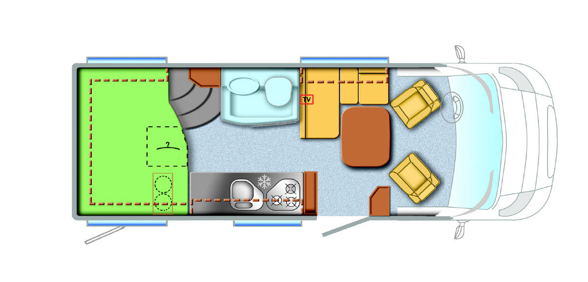 Die Bordtechnik umfasst serienmäßig eine Aufbaubatterie 95 AGM, Radiovorbereitung inklusive Lautsprechern für den Wohnraum und eine Isobox für den Abwassertank. Der Frischwassertank ist innenliegend untergebracht. Die serienmäßige Duocomfort erspart das Wechseln der Gasflaschen, die Truma Secumotion erlaubt europaweit das Heizen während der Fahrt. Die Einstiegstür ist mit einem einteiligen Fliegengitter, Fenster und Mülleimer versehen. Zum serienmäßigen Lieferumfang gehören auch eine vier Meter breite Sonnenmarkise und eine Vorzeltleuchte.