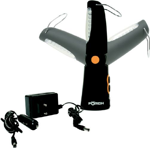Wer beide Hände voll zu tun hat kann auf die neue LED-Akku-Knicklampe 26 Li-ion von Förch zurück greifen. Sie wird einfach auf den Boden gestellt und bringt das Licht dank ihres 120-Grad-Knickkkopfes punktgenau ans Ziel. Alternativ lässt sie sich mit dem klappbaren Haltebügel aufhängen oder mit dem Magneten im Standfuß an Fahrzeugteile heften. Zusätzlich zu den 21 LEDs im Kopfteil verfügt das Produkt über eine 5-LED-Punktlichtquelle in der Gehäusebasis. So hat man im Handumdrehen eine Taschenlampe, die nur 200 Gramm wiegt. Die Leuchtdauer der Hauptlichtquelle soll bei bis zu fünf Stunden liegen. Möglich macht dies der geringe Stromverbrauch und ein leistungsstarker Lithium-Ionen-Akku. Dank des 12-Volt-Lade-Adapters und Schutz nach IP 48 ist die Knickleuchte auch unterwegs ein zuverlässiger Partner.