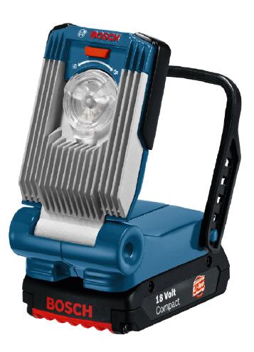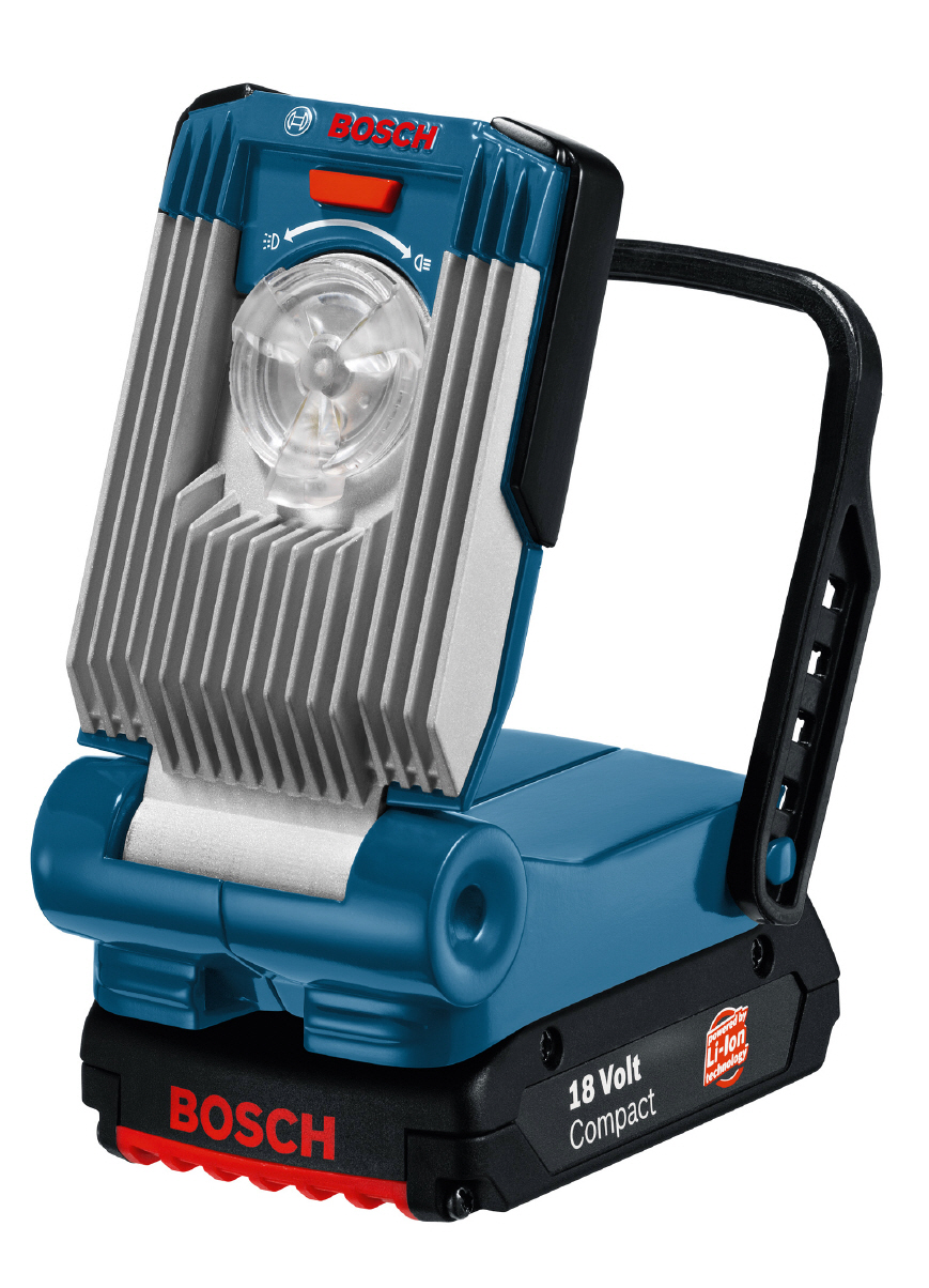 Durch einen innovativen Klappmechanismus ist das Arbeitslicht kompakt und handlich und mit neun einstellbaren Beleuchtungswinkeln für viele Einsätze geeignet. Sie kann als Taschenlampe mit gebündeltem Lichtstrahl für die zielgenaue Ausleuchtung von dunklen Stellen ebenso wie als Arbeitslicht im diffusen Modus für die Beleuchtung größerer Arbeitsbereiche genutzt werden. Die Leuchte (130 x 78 x 41 mm, ohne Akku) kann mit allen 14,4- als auch 18-Volt-Lithium-Ionen-Akkus von Bosch betrieben werden. Für eine lange Lebensdauer der Akkus soll die Electronic Cell Protection (ECP)sorgen. Sie schützt den Akku vor Überlastung, Überhitzung und Tiefentladung. Ein Memory-Effekt bleibt aus, die Akkus sollen auch nach Monaten des Nicht-Gebrauchs einsatzbereit sein. Zur Ausleuchtung des Arbeitsbereichs lässt sich die Leuchte mit einer praktischen Hartgummischlaufe fixieren. Der Hersteller verspricht: Auch nach einem Fall aus zwei Metern Höhe auf Beton ist das Arbeitslicht noch voll funktionsfähig. Preis: rund 65 Euro.