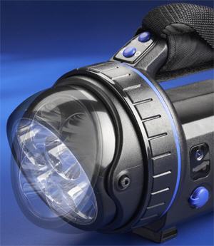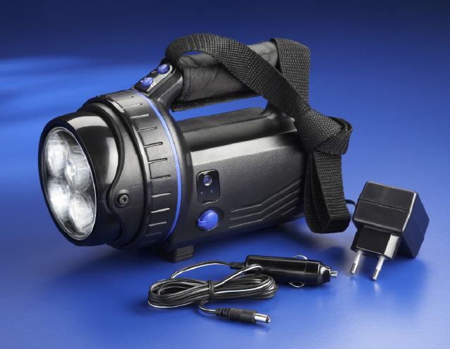 Die Lichtleistung wird durch 4 High Power LEDs erzielt, die Spannung liefert ein wartungsfreier Blei-Akku mit 6V Spannung und 4 Ah Kapazität. Geladen wird er über ein mitgeliefertes Netzteil an der 230 V Steckdose oder über den zum Lieferumfang gehörenden 12V-Ladeadapter. Optional steht eine Wandhalterung mit integrierter Ladefunktion zur Verfügung. Der integrierte elektronische Tiefentladeschutz verhindert die Tiefentladung des Akkus. Durch das intelligente Ladeverfahren kann der High Power LED Akku-Handscheinwerfer PL-838-4x1W permanent mit dem Stromnetz verbunden bleiben. Der Akku-Handscheinwerfer PL-838-4x1W ist komplett geschlossen und spritzwassergeschützt. Eine Besonderheit ist die Notlichtfunktion: Ist der Handscheinwerfer mit dem Stromnetz verbunden, schaltet er sich bei einem Stromausfall automatisch ein. Preis: 69,95 Euro.