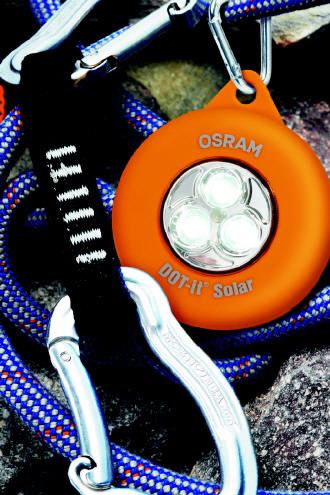 Zuwachs gibt es bei der Produktfamilie der Osram Modellreihe DOT-it, die DOT-it Solar. Um die drei LED des Umwelt schonenden Allroundtalents für bis zu viereinhalb Stunden zum Strahlen zu bringen, soll bereits indirektes Sonnenlicht genügen. Damit taugt das Gerät speziell für Frischluft-, Camping- und Wanderfans. Tagsüber hängt man das DOT-it Solar mit dem Karabinerhaken auf, lädt es mit Sonnenlicht aufladen und kann am Abend bei LED-Licht ein gutes Buch lesen.