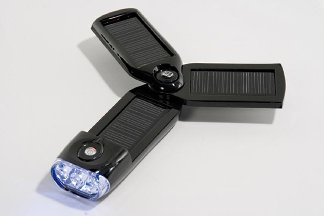 Ebenso praktisch und umweltfreundlich ist auch das Handyladegerät. Das handliche Teil passt in jede Hosentasche, zur Stromgewinnung wird es zu einem kleinen Propeller aufgefächert. Drei Solarzellen speichern die Energie in einem Akku, der kann mit einem passendem Handyadapter die meisten gängigen Mobiltelefone speisen. Praktisch, wenn man erst unterwegs bemerkt, dass das Handy leer ist. Außerdem ist das Ladegerät mit einer praktischen Taschenlampe ausgestattet.