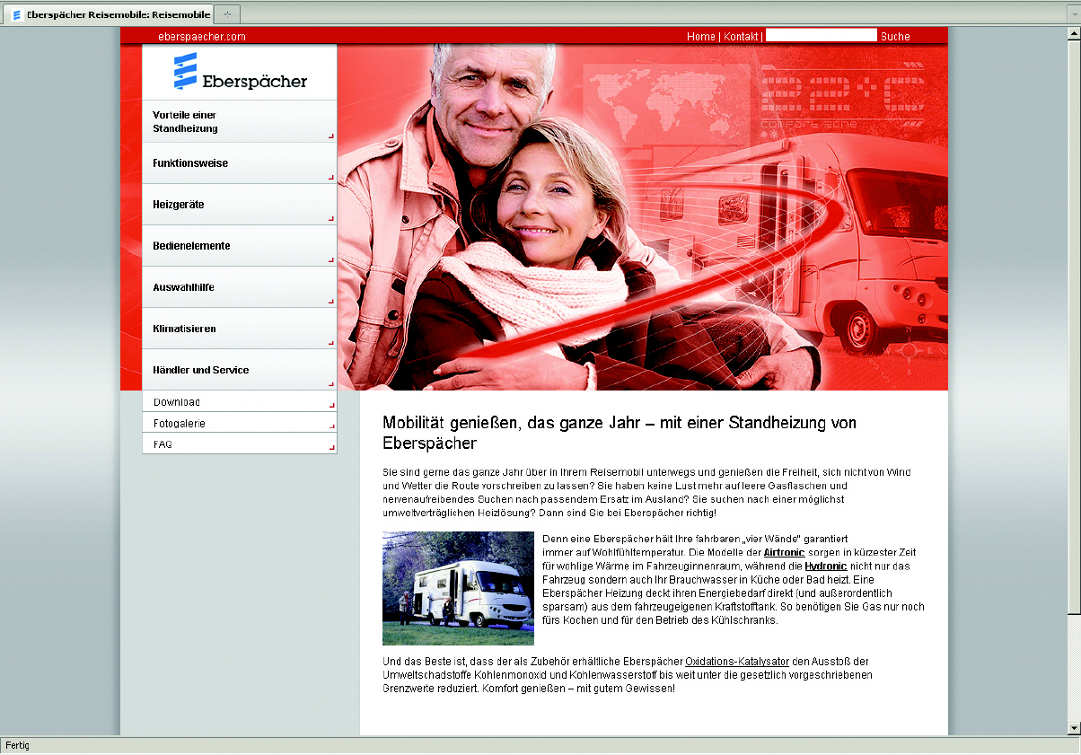 Mit einer Standheizung von Eberspächer ist Urlaub mit dem Reisemobil das ganze Jahr über möglich. Wie das geht soll der neue Internetauftritt www.eberspaecher-reisemobile.de zeigen. Die Menü-Führung hilft bei der Wahl der passenden Standheizung, für Ausflüge mit dem Reisemobil bei jedem Wetter.
