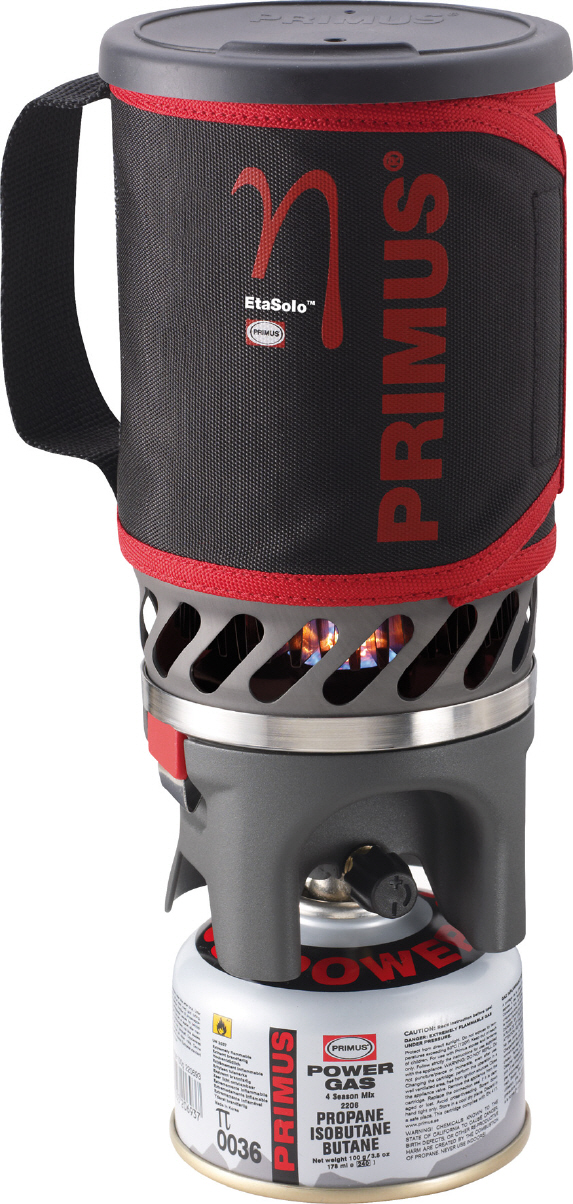 Der jüngste Spross aus der Kocher-Serie von Primus heißt EtaSolo. Das integrierte Kochsystem der Schweden besteht aus Brenner, Kartusche, Windschutz und Topf mit Wärmetauscher, Deckel und einer Isolation. Alle Komponenten können zusammen mit einer 100 g Gaskartusche platzsparend im Topf verstaut werden.