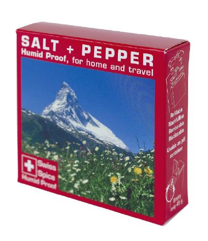 Swiss Spice taugt für Outdoor, Camping, Picknick, Grill und Zuhause. Hinter Swiss Spice verbirgt sich ein Salz- und Pfeffer-Streuer, praktisch, leicht und handlich. Und mit spritzwasserfestem Verschluss. Der öffnet sich nur unter Anwendung eines Druckes von rund 500 Gramm. Der Hersteller sagt, das Produkt sei „dicht wie eine Schweizer Bank“. Dadurch geht der Verschluss nicht von alleine auf. Und obendrein verklumpt das Salz nicht. Die Verschlusskappen sind unterschiedlich geformt, so dass man sogar im Dunkeln Salz und Pfeffer unterscheiden kann.