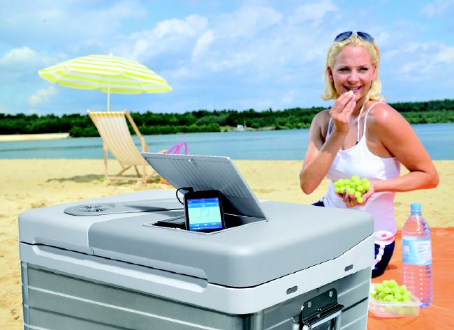 Eiskalte Getränke und Snacks am Strand, dazu gleich die coolsten (oder heißesten) Songs, das macht die jüngste Produktstudie von Waeco durch ein in den Deckel integriertes Soundsystem mit einem Anschluss für MP3-Player möglich Die 40 Liter fassende thermoelektrische Kühlbox kühlt und soll eine hervorragende Klangqualität bieten. Der Sound wird nicht von Lautsprechern übertragen, sondern die Musik-Box verfügt über einen Kontaktschallgeber, der das gesamte Volumen des Gehäuses nutzt. Perfekter Musikgenuss soll das Ergebnis sein. Weiterer Vorteil dieser Technik: Da der Kontaktschallgeber feuchtigkeitsunempfindlich ist, soll die Soundbox den einen oder anderen Wasserspritzer problemlos vertragen. Ein ausklappbarer Multifunktionsgriff erleichtert das Tragen. Der geteilte Deckel vermeidet beim Öffnen unnötige Wärmeverluste. Die Box bietet 2-Liter-Flaschen stehend Platz und verfügt über eine automatische Umschaltung vom 12- auf 230-Volt-Betrieb.