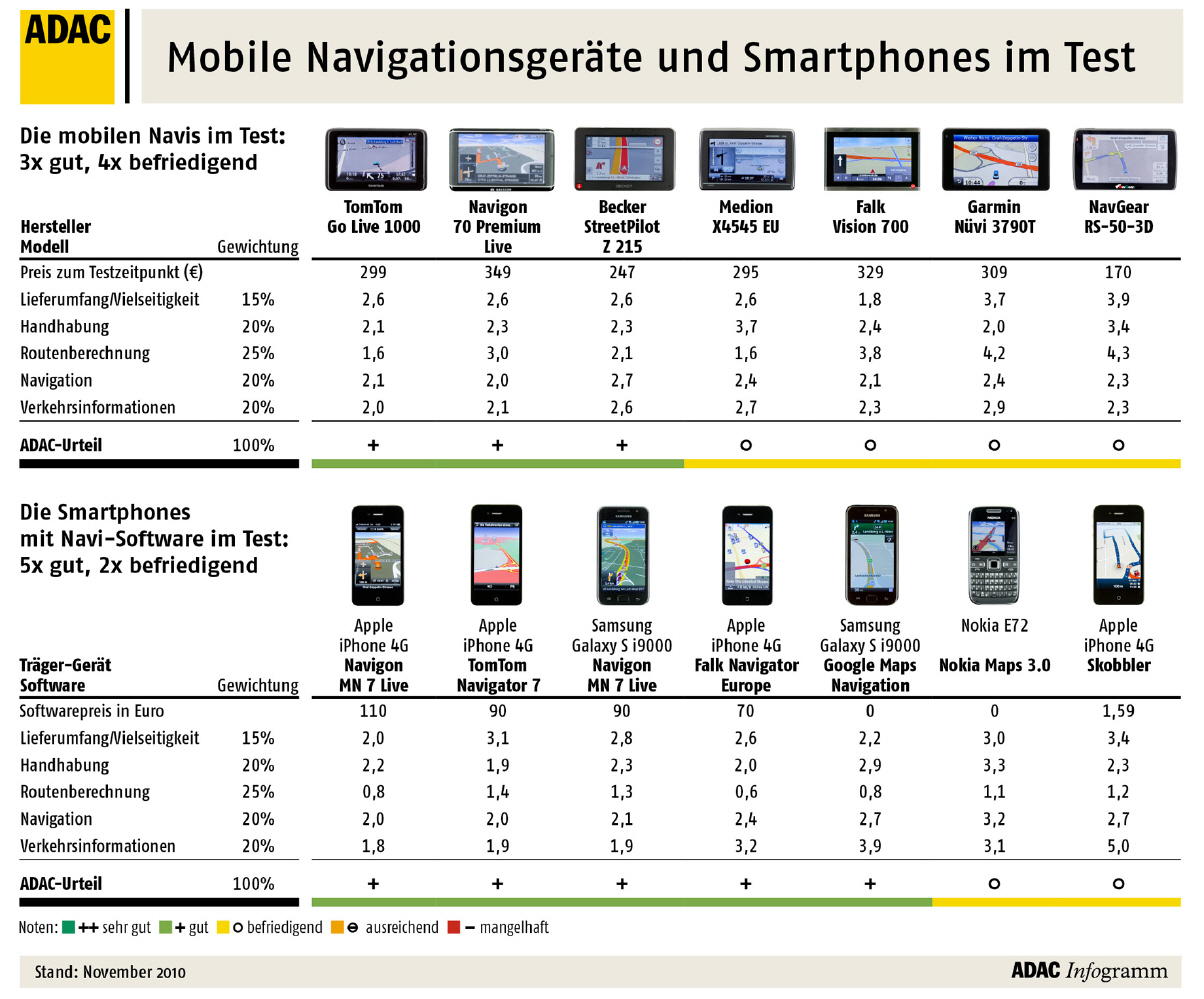 Zu einer ernst zu nehmenden Alternative für herkömmliche mobile Navigationsgeräte haben sich Smartphones mit Navigationssoftware entwickelt. Das bestätigt ein ADAC-Test von je sieben Geräten aus beiden Kategorien. Gesamtsieger wurde die Navigationssoftware MN 7 von Navigon. Sie erhält die Bestnote 1,7, im Test lief sie auf Apples iPhone 4. In den Kriterien „Routenberechnung“ und „Verkehrsinformationen“ bekommt sie Topbewertungen. Auch in den anderen Kriterien erreicht diese Lösung durchweg gute Noten. Bei den Navigationsgeräten sticht das Modell Go Live 1000 von TomTom hervor, vor allem wegen seiner guten Routenberechnung (Bewertung 2,0). Immerhin fünf Softwarelösungen für Smartphones erreichen das Gesamturteil „gut“. Bei den Navigationsgeräten schneiden nur drei mit „gut“ ab. Kein Produkt erhielt die Note „sehr gut“.