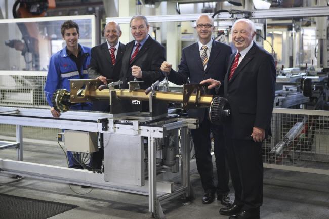 Die 20-millionste Achse ist jetzt bei Al-Ko vom Band gelaufen. Unser Foto zeigt in der Produktion in Kleinkötz (von links): Michael Merz, Anlagenführer an der Achseinschubmaschine, Produktionsleiter Rainer Troglauer, AL-KO Vorstand Harald Kober, Harald Hiller, Leiter Unternehmensbereich Fahrzeugtechnik Europa und Aufsichtsratsvorsitzender Herbert Kober.