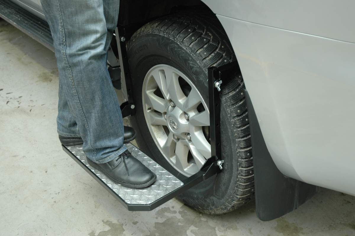 Der Sheriff Radtritt soll die Beladung des Dachgepäckträger erleichtern. Die Montage ist simpel: Aufklappen und über das Rad hängen, fertig. Wird der Radtritt nicht gebraucht, kann er zusammengefaltet und flach im Fahrzeug verstaut werden. Der Rahmen ist aus Kunststoff-beschichtetem Stahl, die Trittauflage aus Alu-Riffelblech, die Reifenbreite kann individuell eingestellt werden. Der Radtritt ist für 49,90 Euro zu haben.