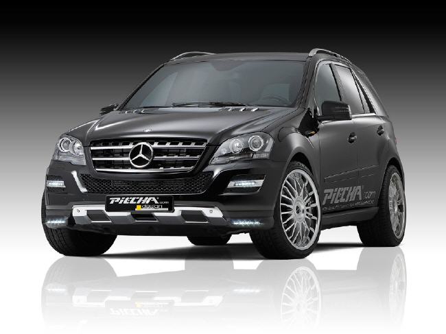 Nur für die Frontpartie der M-Klasse offeriert Piecha Design LED-Tagfahrlichter für 495 Euro. Sie sind in Frontspoilerecken in Strukturlack integriert, welche die Linie der Seitenschweller nach vorn fortführen. Bei Fahrzeugen mit serienmäßigen Nebenscheinwerfern leuchten die Tagfahrlicht-LEDs tagsüber in voller Brillanz, während sie bei eingeschalteten Hauptscheinwerfern auf 20 Prozent Licht-Leistung abdimmen und dann zusätzliche Positionslichter sind. Bei Fahrzeugen mit serienmäßigen Tagfahrlichtern hingegen leuchten die Piecha-Tagfahrlichteinsätze nur bei eingeschalteten Hauptscheinwerfern und fungieren stets als Positionslichter. Beide Versionen sind vom TÜV abgesegnet und ohne Eintragung zulässig.