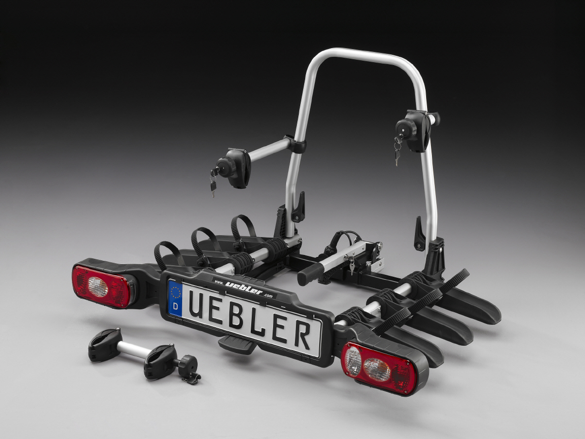 Die Befestigung auf der AHK erfolgt mit einem patentierten Schnellverschluss, eine Einstellung soll überflüssig sein. Die Befestigung der Fahrräder übernehmen (bis zu einem Rahmendurchmesser von 80 mm) abschließbare Abstandshalter und ein Ratschensystem für die Fahrradreifen. Beim Uebler X21 nano stehen die Fahrradschienen 220 mm weit auseinander, so finden auch große Fahrräder Platz. Für den Transport des Trägers und seine Unterbringung in Keller oder Garage sorgt eine Transporttasche aus hochfestem Material. Die Ausstattung wird durch einen im Kennzeichenhalter integrierten Tragegriff, einen Steckerhalter für den 13-poligen Stecker und ein Ein-Schlüssel-System abgerundet. Die Preise liegen bei 589 (für den X31-Träger) bzw. 489 Euro für den kleineren X21 nano. Weitere Infos: www.uebler.com.