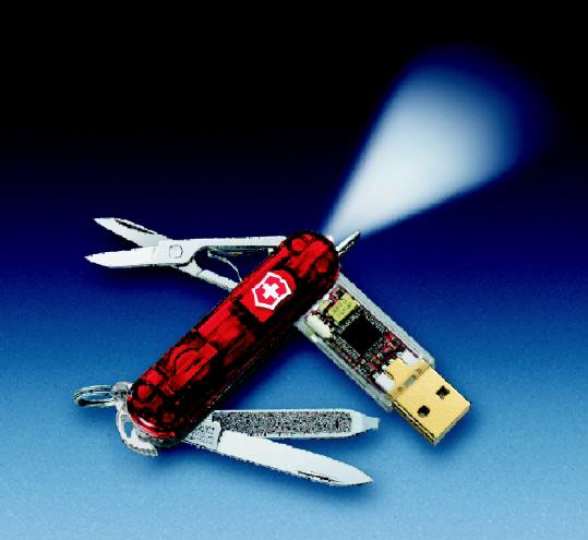 So stellt etwa das SwissMemory USB von Victorinox die praktische Verbindung eines traditionellen Schweizer Taschenmessers mit einem Hi-Speed USB-Speicher dar. Das nützliche Reise-Utensil gibt es mit einer Speicherkapazität von bis zu zwei GB. Und neuerdings - zusätzlich zur klassischen Variante in rubyRED – auch als schicke Silver Edition unter dem Namen retroALOX.