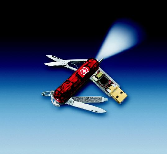 Auch für den Büroalltag kann Victorinox, Hersteller der weltweit bekannten Schweizer Taschenmesser, passende Helferlein offerieren. Mit den Modellen Swiss Flash und Swiss Flash Light drängen die Eidgenossen in den Geschäftsbereich und setzen auf Word und Powerpoint. Hervorstechendes Merkmal der neuen Modelle sind abnehmbare USB-Sticks mit bis zu 16 GB Speicherplatz plus Schreibschutzschalter. Für die Präsentationen gibt es beim Swiss Flash einen roten Laser (SwissFlash), das SwissFlash Light leuchtet einem mit 18 cd heller Lampe Heim. Mit dabei ist auch ein Kugelschreiber für schnelle Notizen unterwegs (Ausnahme ist das Alu-Modell). Ebenfalls mit dabei: Ein kleines Messer, kleine Schere und Feile und Winzmesser. Wer öfter fliegt, greift zur Flight Version, die auf die kleinen spitzen Helferlein verzichtet. Komplett ist Swiss Flash Light kaum größer als ein handelsüblicher USB-Stick, so findet das Schmuckstück an beinahe jedem Schlüsselbund Platz. Preis mit vier GB Speicherplatz: Rund 68.— Euro.