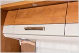 Eine Neuerung findet sich hinter der Serviceklappe auf der Fahrerseite: Dort sind die WC-Cassette und der Platz für eine Ersatz-Cassette untergebracht, außerdem die Zentralversorgung für Wasser und Strom. Der Frischwassertank des Nasenbären fasst 200 Liter, in den Abwassertank passen 105 Liter. An die mittig montierte Tür zum Wohnbereich schließt sich die Küchenzeile mit dreiflammigem Gasherd an. Praktisch sind die breiten Schubladen im unteren Teil mit ihrem großen Fassungsvermögen und der 141 Liter fassende Kühlschrank. Auch der Sanitärbereich hinter der Sitzbank bietet reichlich Platz für die Körperpflege. Im Heck stehen zwei große Einzelbetten zur Verfügung. Sie sind auf einem Podest montiert, darunter befindet sich die Heckgarage. Neuerungen gibt es auch beim Möbelbau: Bei den Hängeschränken verbergen sich die Schlösser hinter Klappen. Die Kanten und Ecken werden mit gerundetem Holz verdeckt.