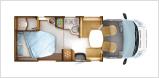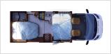 Den bekannten Einzelbetten-Grundriss zeigt Pösslauf der CMT erstmals auf der Basis von Fahrzeugen der Marken Citroen und Fiat. Detaillösungen wie ein Kleiderschrank unter dem linken Einzelbett sollen beim neuen Globestar 600 L für ein gutes Raumgefühl sorgen. Mit dem Neuling bringt Pössl die Einzelbetten des Campscouts auf einer Fahrzeuglänge von nur 5,99 Meter unter. Dazu wurden die Halbdinette minimal verkürzt und der kompaktere Kleiderschrank und Küchenblock aus dem Roadscout R verbaut. Der Küchenblock bietet drei Schübe für Küchenutensilien und einen 65 Liter Kompressor-Kühlschrank. Der zweite Kleiderschrank hat seinen Platz unter einem der Einzelbetten. Das Bad ist mittig platziert und trennt den Wohn- vom Schlafbereich. Hinter dem Raumbad folgen die längs verbauten Einzelbetten. Die Bettenmaße belaufen sich auf links 180 x 83 cm und rechts 193 x 83 mm. Mit Mittelteil ergibt sich ein Bett von 180/193 x 196 mm.
