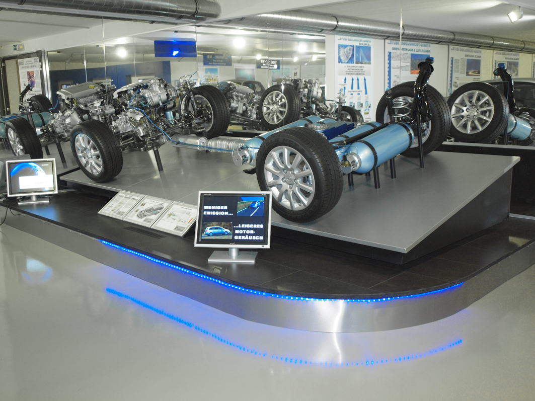 Ein Stück greifbarer scheint eine mobile Zukunft mit Elektroautos. Das Hybridfahrzeug als Brückentechnologie mcht Fortschritte und steigert seine Absatzzahlen. Alternative Kraftstoffe wie Gas oder Bioethanol sind inzwischen bereits Alltag an der Zapfsäule. Der Energieträger Wasserstoff gilt längst nicht mehr als nicht umsetzbare Zukunftsmusik für Science Fiction Romane. Im Museum Autovision kann man sich genügend „Beweismaterial“ dazu anschauen. Pünktlich zum 125. Geburtstag trafen in Altlussheim gleich drei neue Fahrzeugkonzepte für den Ausstellungsbereich „Mobilität der Zukunft“ ein: Ein serienreifer Dieselhybrid, ein Brennstoffzellen-Schnittfahrzeug und ein Erdgas-Schnittmodell.