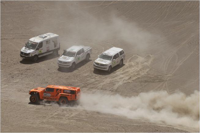 Die Etappen der zweiten Rallye-Halbzeit führten von der chilenischen Bergbaustadt Copiapo nach Lima - und sie forderten noch einmal alles von der VW Flotte. Auf den harten Schotterpisten am Fuß der Anden bewährte sich erneut der Achleitner-Allradantrieb des Crafter 4Motion. Dank drei zuschaltbarer Sperren ließ sich der große Transporter von Volkswagen auch vom berüchtigten Fech-Fech - dem puderfeinen und bis zu knietiefen Staub der Wüste Atacama - nicht aufhalten. Auf den teilweise recht eintönigen Tagesetappen – den Rekord stellte eine über 52 Kilometer lange Gerade in Peru auf – mit striktem Tempolimit von 100 km/h in Chile und 90 km/h in Peru erhöhte das Achtgang-Automatikgetriebe des neuen Amarok Automatic den Komfort für die Fahrer spürbar. Das überzeugte auch Ex-Formel-1-Pilot Jacky Ickx nach einer Testfahrt am Ruhetag in Copiapo: „Der Amarok Automatic hat mich beeindruckt. Sehr gut gefallen hat mir die Option, Gänge auch manuell wechseln zu können. Mit dem Amarok Automatic habe ich offroad Stellen erreicht, die ich kaum für möglich gehalten hätte.“